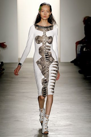 For a newcomer, Joseph Altuzarra is an exacting designer. There was an uncompromising rigor to the 27-year-old's Spring collection of duchesse satin dresses and suits spliced with geometric strips of python and metallic leather, not to mention an impressively high level of workmanship. "I asked myself what makes clothes feel modern," the CFDA/Vogue Fashion Fund nominee said backstage, explaining that he looked to the Internet for answers, borrowing not only bits from the sixties, but also techno and tribal elements, as well as a hefty helping of French chic. We'd also throw in deconstruction, and subtle nods in the direction of both Tom Ford and Claude Montana.